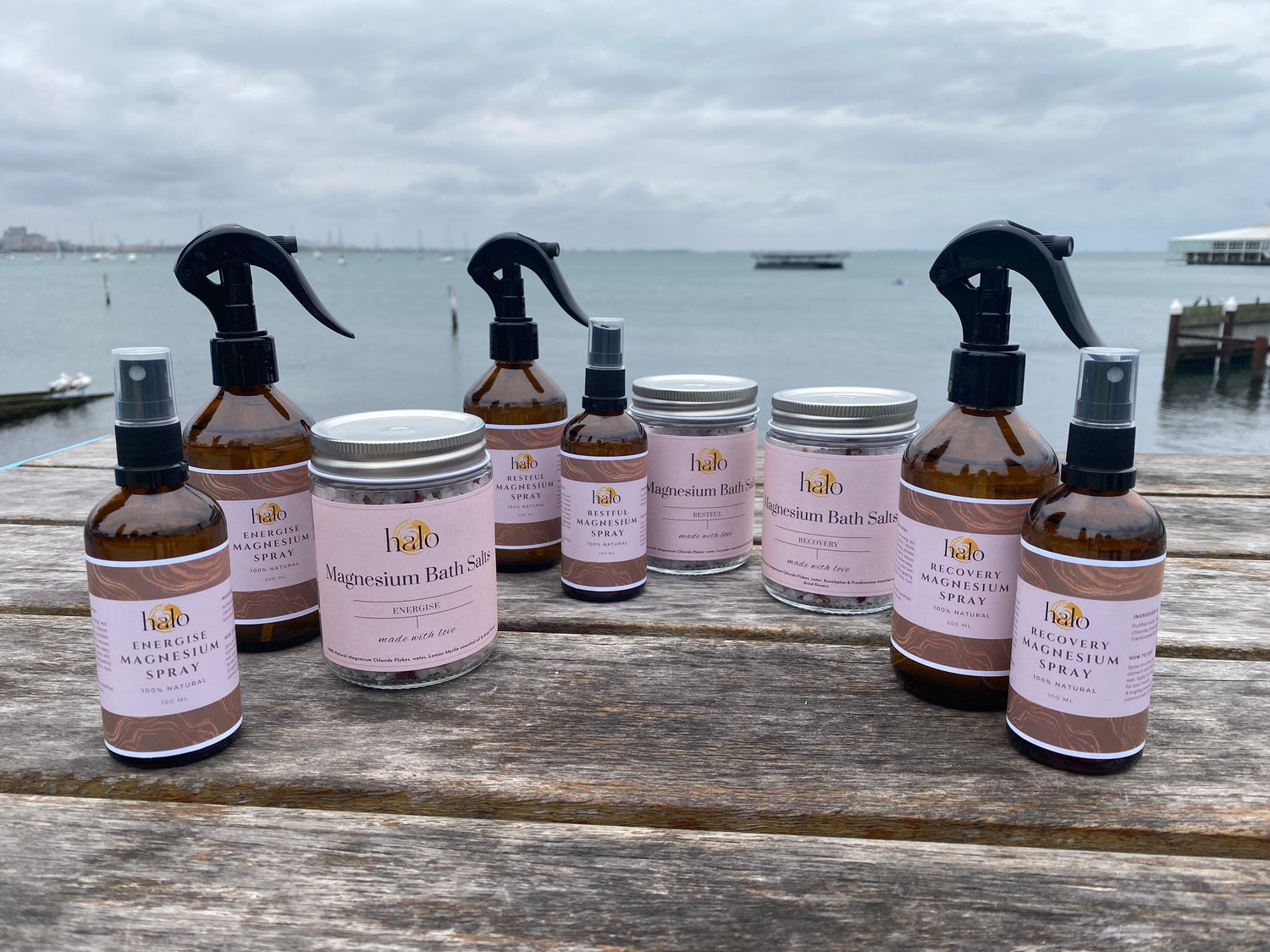 Halo Natural Care Magnesium offers 100ml & 200ml sprays and 300ml Bath Salt jars with three blends.